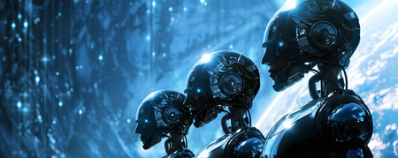 A trio of sleek, futuristic robots stands in close formation, their reflective surfaces glistening under a sea of vibrant blue lights, embodying advanced technology and innovation.