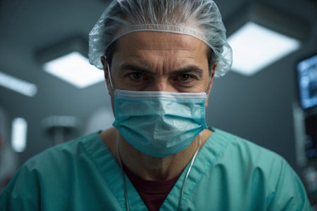 A close-up shot of a surgical professional in an operating room, showcasing dedication and focus amidst intense overhead lights. The image highlights the seriousness and precision in a healthcare environment.