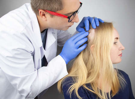 A doctor trichologist conducts a study of the hair of a blonde. Alopecia treatment. Hair loss, alopecia, itching, burning in the head, seborrhea or brittle ends