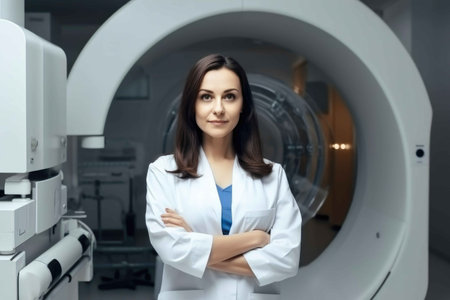 Female radiologist standing near mri machine. Generative AI