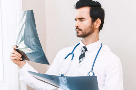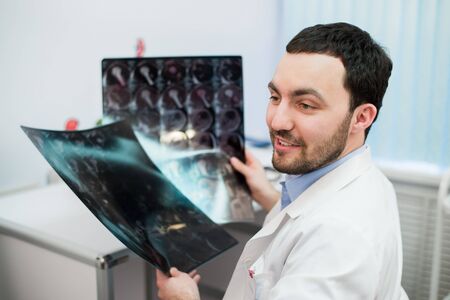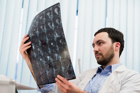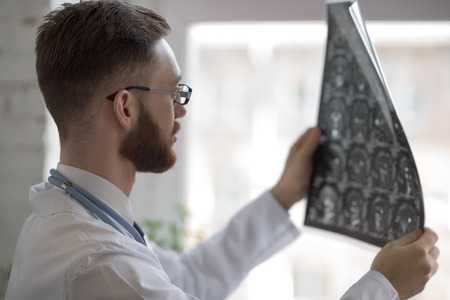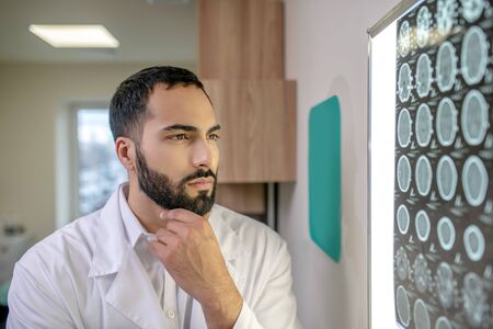 MRI results. Bearded young doctor in a white robe analyzing MRI results