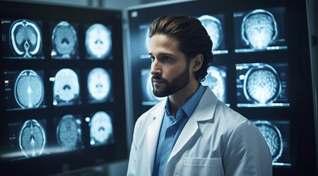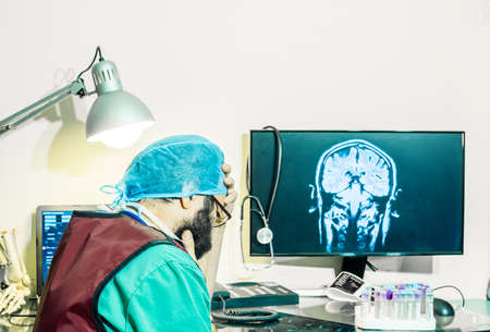 Closeup portrait of intellectual man healthcare personnel with white labcoat, looking at brain x-ray radiographic image, ct scan, mri, clinic office background. Radiology department.