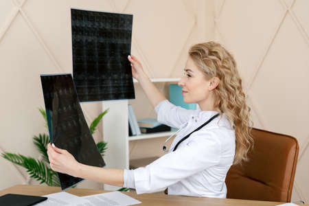 Woman doctor looking at x-ray or magnetic resonance scan of the brain. Professional medic wearing in white uniform with stethoscope, sitting in modern clinic office. Health check up, insurance concept