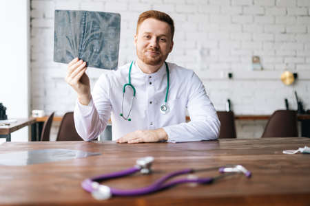 Portrait of happy male doctor in white uniform examining brain computerized tomography scan sitting at desk in hospital office, thinking about diagnosis. Concept of medicine and health care.