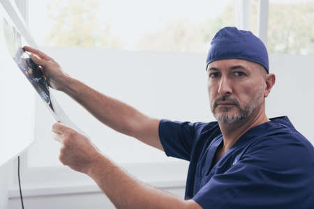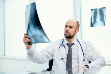 Orthopedist doctor examining X-ray picture in hospital or clinic