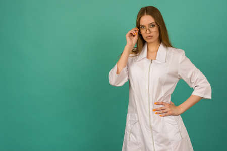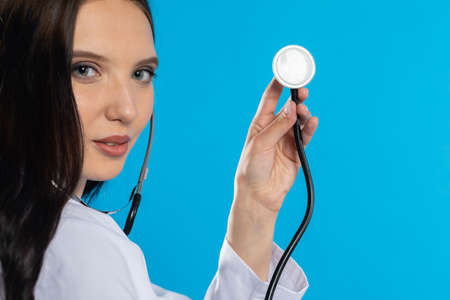 Portrait of a female doctor with makeup in a white coat with a phonendoscope in her hand