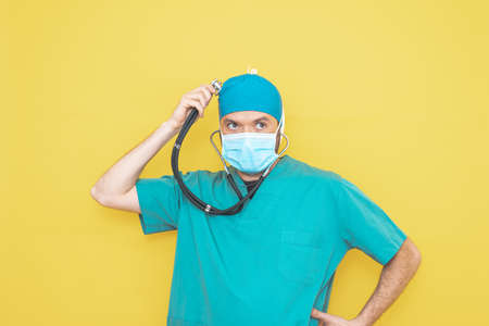 Surgeon dressed in operating theater uniform and stethoscope, on yellow background.