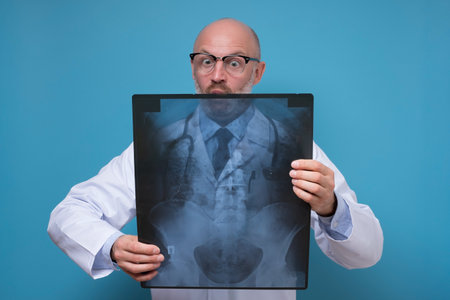 Mature male doctor with x-ray scan of pelvic area