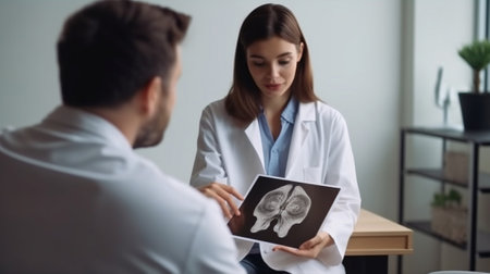 Survey radiography of the skull of a man. A doctor radiologist is studying an x-ray examination. A snapshot of the skull is placed on the patient’s head.