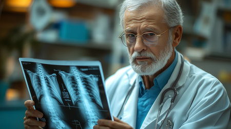 a doctor analyzing a chest x ray with a stethoscope in a hospital environment with a serious look