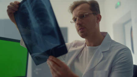x-raying health problems. nurse checking x-ray film at hospital. Analyzing Chest X-ray In Examination Room. man look at roentgen. Radiologist hold xray. doctor examines radiographical snapshot