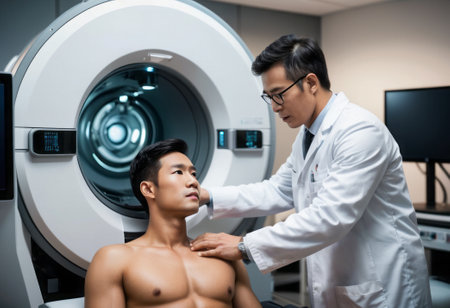 A male doctor preparing a patient for an MRI scan in a modern medical facility, focusing on precision and care.
