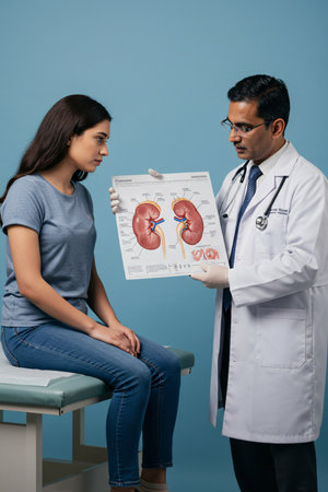 Medical professional showing kidney anatomy chart to patient during consultation in clinic, representing healthcare, nephrology, diagnosis, and patient education.