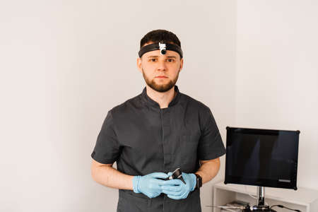 ENT doctor with otoscope. Otoscopy. Treatment ear pain