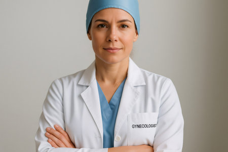 Confident gynecologist posing with arms crossed, conveying professionalism and expertise in women's health