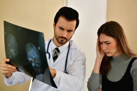 Health Concepts. Doctor and patient viewing x-ray film. The doctor and the patient feel relaxed at the check-in time. The doctor encouraged the patient. Inside the hospital are doctor X-ray patient.