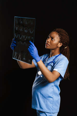Black pregnant doctor wearing face mask posing with X-ray isolated over dark background