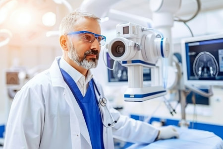 Side view of Caucasian male surgeon reading x ray in operating room at hospital