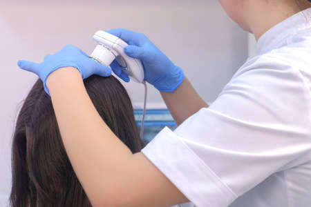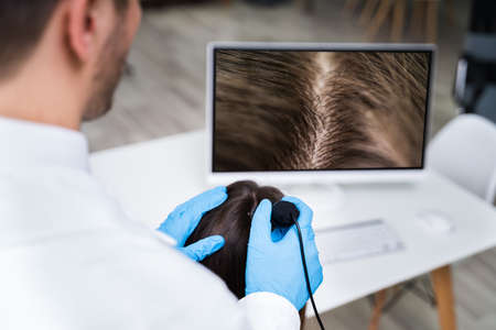 Doctor trichologist examines woman patients hairs using trichoscope in clinic, closeup hand view. Runs a trichoscope over scalp and sees result on monitor screen. Procedure of computer trichoscopy.