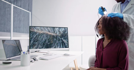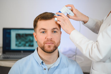 Close-up Of Dermatologist Using Trichoscope For Hair Fall Treatment His Clinic