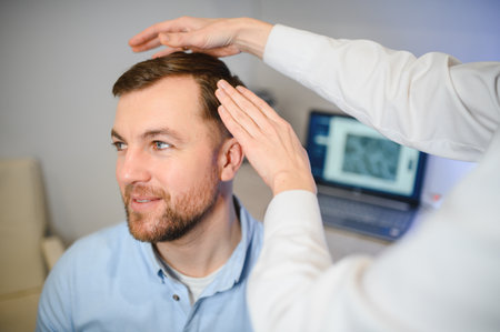A trichologist examines the hair of a man who begins alopecia. Consultation with a dermatologist. Hair loss, alopecia, pruritus, burning head or seborrhea