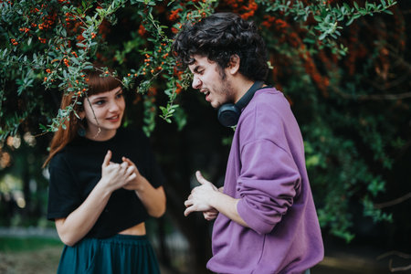 Young friends enjoying a lively conversation outdoors in nature