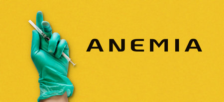 A person holding a syringe with the word Anemia written below. Concept of urgency and importance