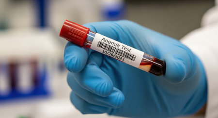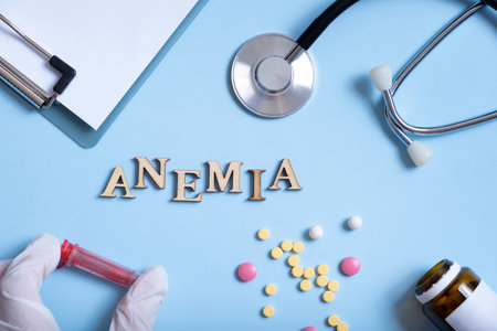 Anemia text with container for blood analysis in gloved hand, stethoscope, pills flat lay, top view.