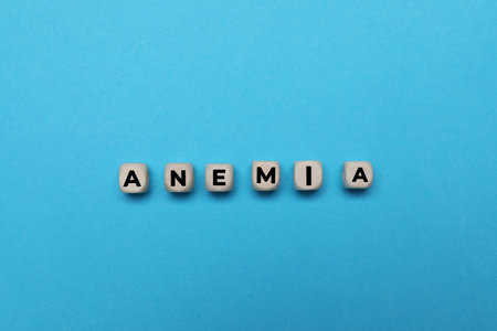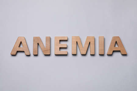 Word Anemia made of small wooden cubes on light blue background, flat lay