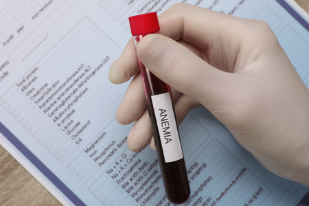 Doctor holding test tube with blood sample and label Anemia over medical form, top view