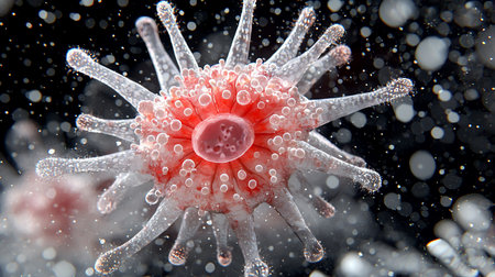 A highly detailed 3D illustration of a virus particle, showcasing its spherical core and numerous translucent, spiky protrusions.