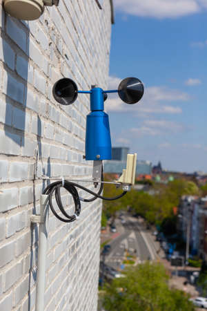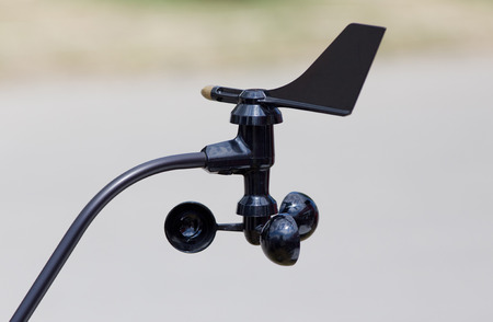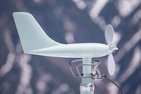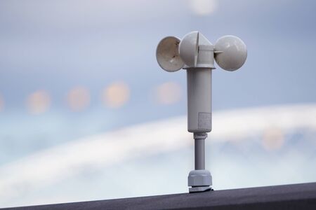 White mechanical wind speed and pressure sensor-anemorumbometer. The movement of blades of the sensor, Meteorology, research development, climate measurements