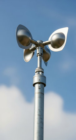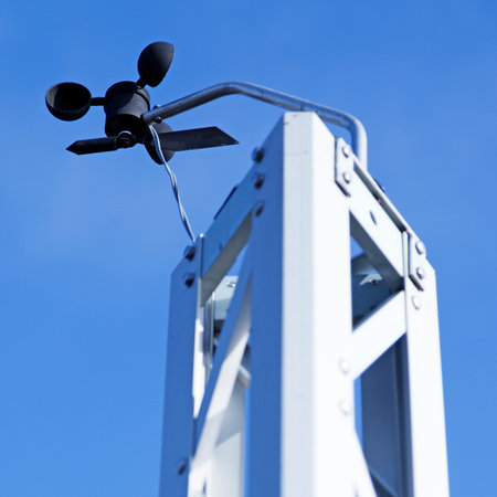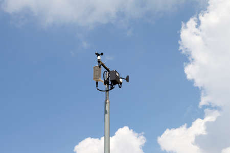 Weather station, anemometer measuring wind speed and direction, against a blue, cloudy sky