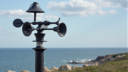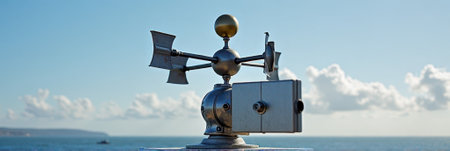 Coastal weather vane overlooking ocean and rocky shoreline. That the image is generated using AI.