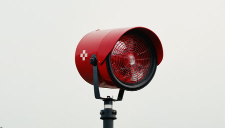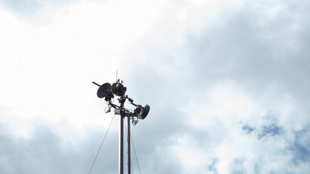 Outdoor multi-horn weather siren mounted on metal pole against blue sky
