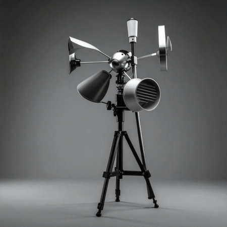 A complex and meticulously engineered meteorological instrument stands ready on its tripod. This custom-built device, with its array of sensors and vanes, is designed for precise data collection, embodying concepts of scientific innovation, weather forecasting, and environmental monitoring in a striking black and white studio setting.