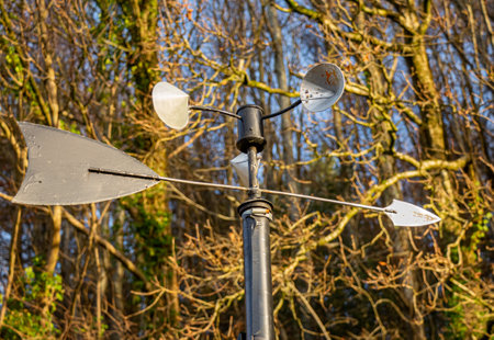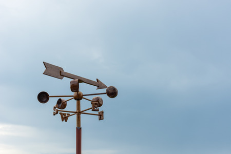 Vintage wind vane on blue sky. Measuring wind speed and direction.