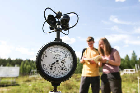 Saint-Petersburg, Russia - July 11, 2015: Meteorological Institute students on practical training in the field of study parameters measuring instruments weather changes, anemometer