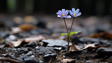 Ground level view of delicate purple wildflowers thriving in their natural habitat with a dreamy forest backdrop in soft focus.