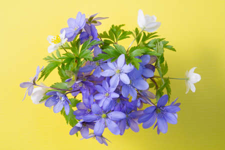 Bouquet of Liverleaf and Anemone flowers on a yellow background