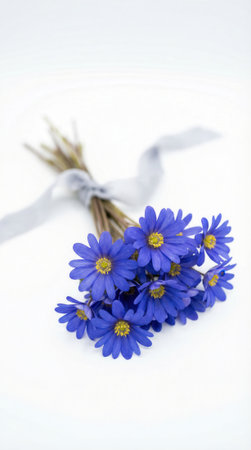 Blue daisy bouquet arranged with a soft gray ribbon on a white surface. The compact bundle shows blue petals and yellow centers under diffuse natural light. Minimal background offers clean composition for floral designs