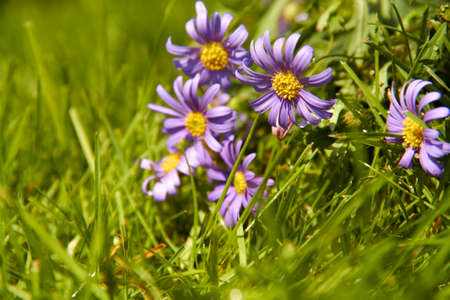 Purple daisies on a green meadow in the summer
