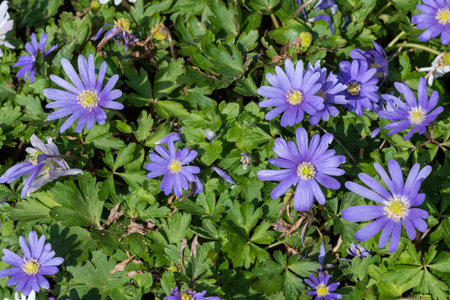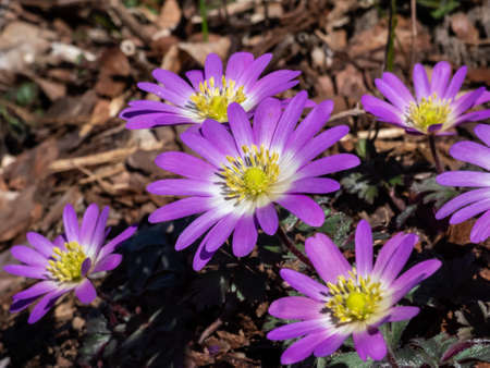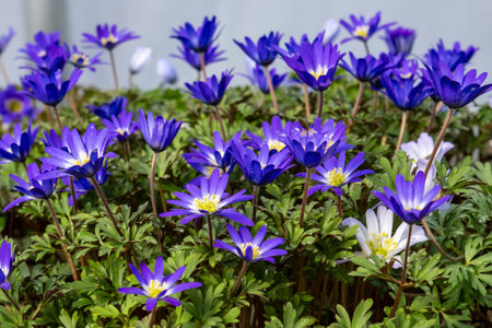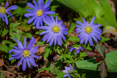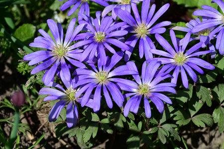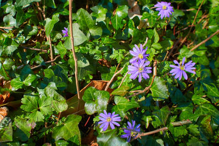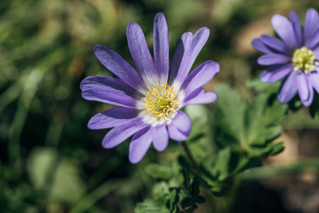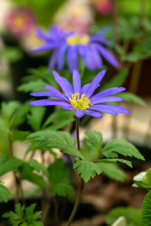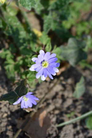 Anemone blanda Grecian winter windflower flowers in bloom, beautiful ornamental blue purple violet plant in bloom in early springtime in the garden