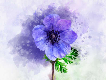 Watercolor painting of a blue anemone flower. Botanical illustration.