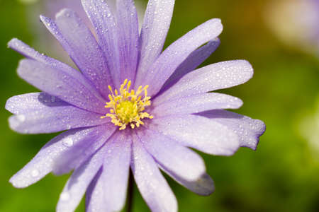 Purple anemone flower with water droplets on petals