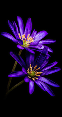 Two vibrant purple flowers are delicately displayed against a dark, black backdrop. The focus is on the detailed structure of the petals and the central part of each flower, showcasing the deep purple tones and the fine details of the flower's anatomy. The image emphasizes the beauty and vibrant color of the flower in sharp contrast to the dark background.
