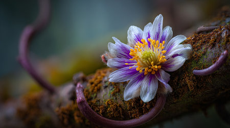 Delicate Purple and White Flower Resting on Mossy Branch, Nature's Beauty