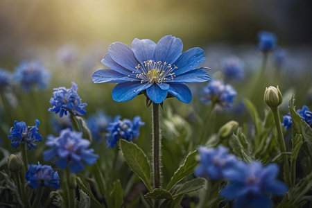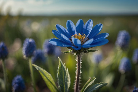 Blue flower in the meadow with blue flowers in the background.