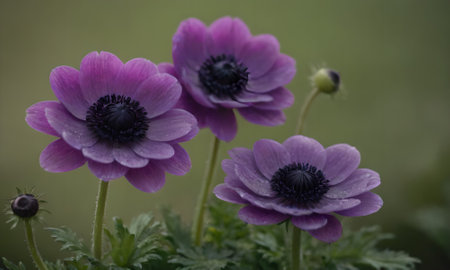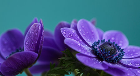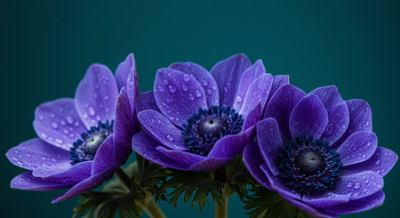 purple anemone flowers with water drops on dark green background