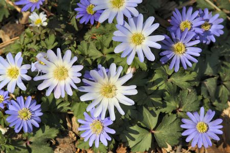 Close-up of the Balkan anemone, Grecian or winter windflower (Anemone blanda) flowering with blue flowers in bright sunlight in rock garden
